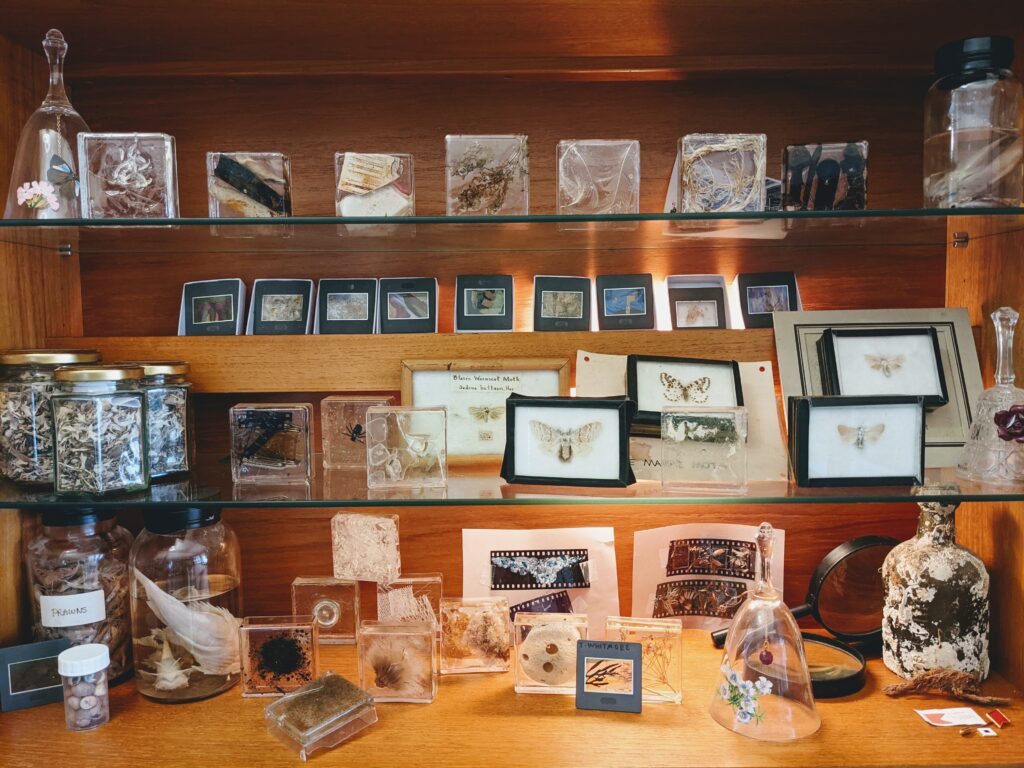 The Cabinet of Mundanities & Ephemeralities draws on the Victorian hobby of specimen collection (some of which, like seaweed collections, are used today to track changing biodiversity) and the Cabinet of Curiosities style museum. These were arranged to situate the western world at the pinnacle of human evolution. However, I’m more interested in a cabinet that is participatory, hybrid, containing the overlooked and things that might be lost. So there is sand, grass, dirt, seawater and different kinds of plastic waste, as well as objects made by local participants. I made kits as socially distanced participation tools, so people could have a go at some of the techniques I use – from using living plants as slides or filters or drawing/painting on discarded celluloid to make micro cine animations”